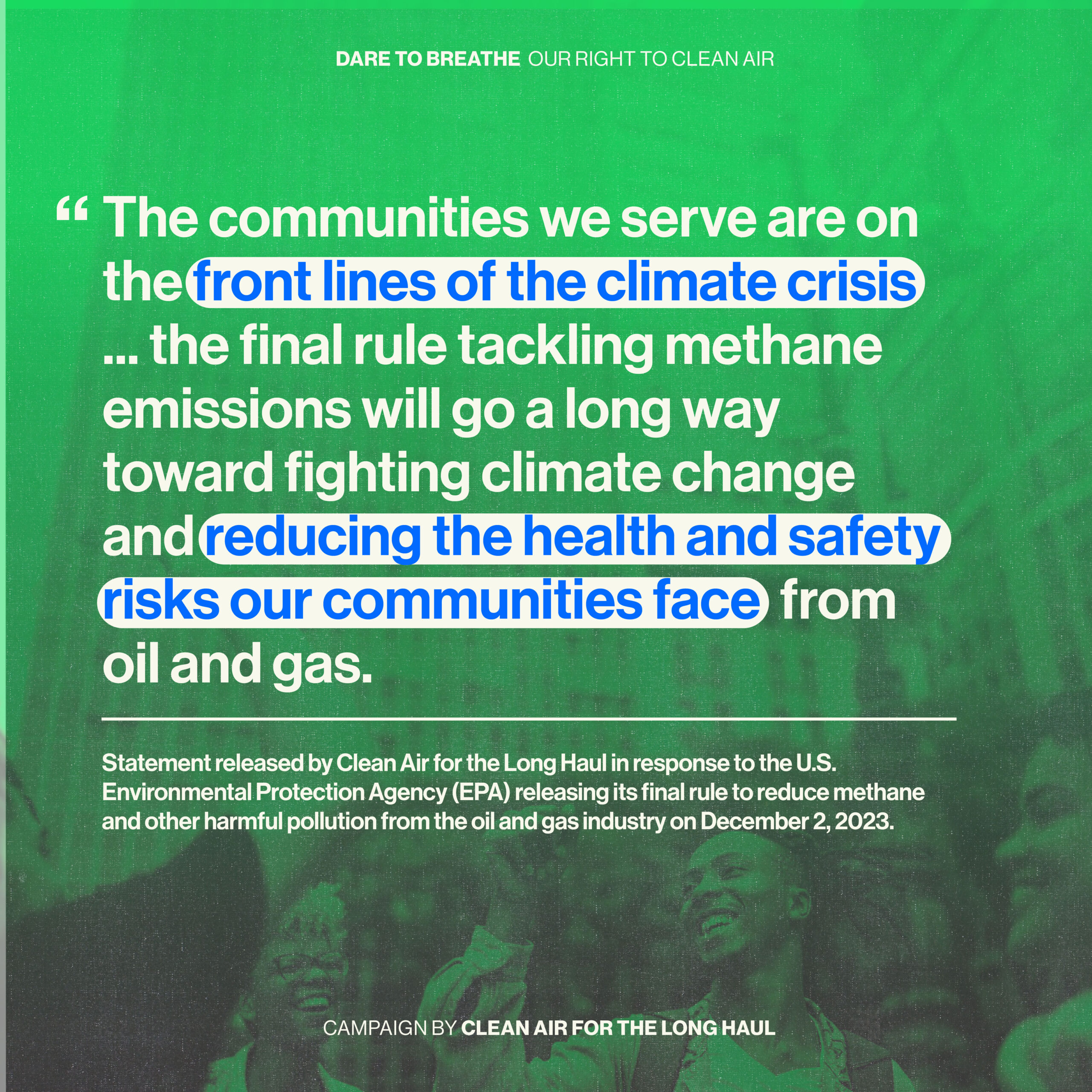 That is why we advocated for stringent, health protective standards that would curb methane and other toxic air pollutants from oil and gas operations, including holding the largest offenders accountable. Now, the Trump EPA is seeking to postpone compliance deadlines and delays climate action and much needed improvements for frontline and fenceline communities. We will hold the line and ensure that polluters are held accountable and our communities are protected.