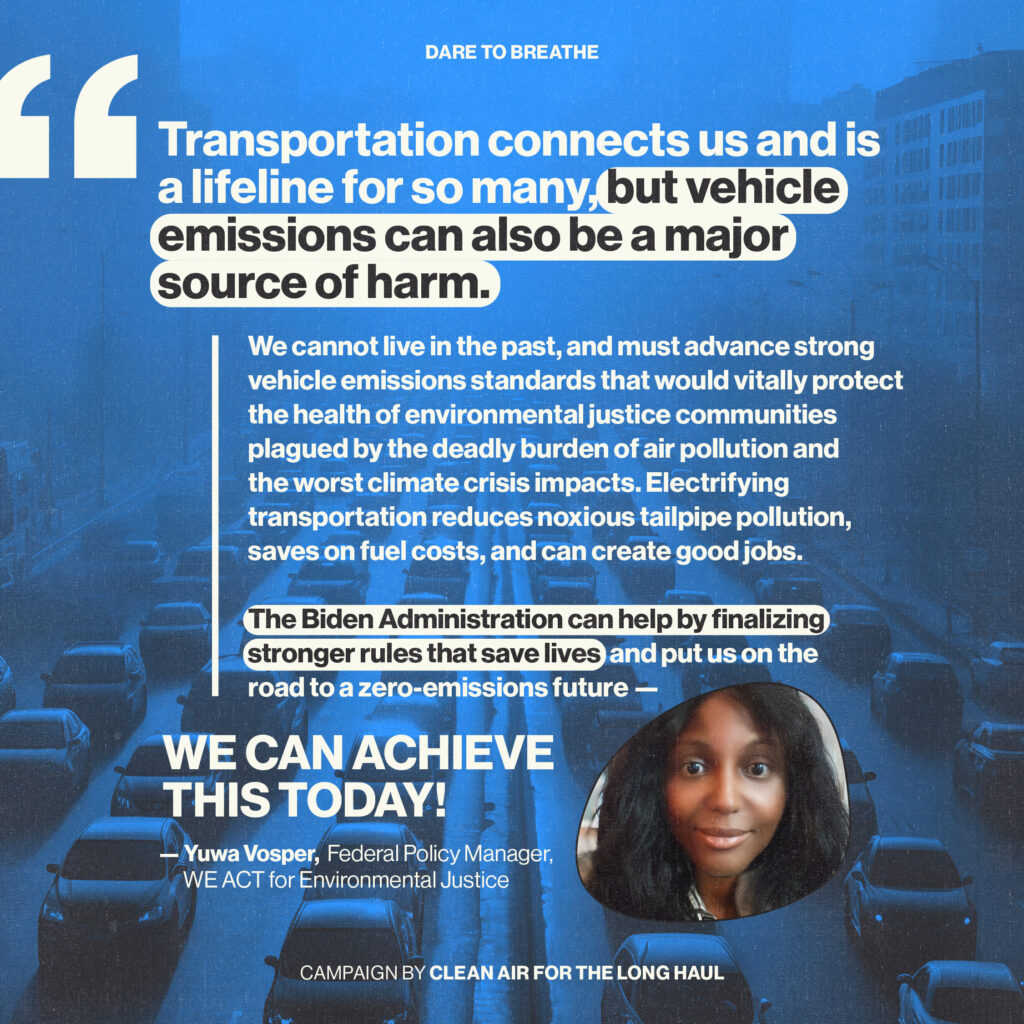 The Trump administration’s EPA is gutting these advancements and giving polluters free reign to harm our health and futures. We’re pushing back and fighting to ensure that communities overburdened by transportation pollution and negatively impacted by climate change are protected.
